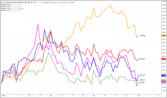 Les monnaies les plus frappées par la “crise des émergents” tels que la lire turque (TRY) et le rand sud-africain (ZAR) ont effacé la plupart de leurs pertes enregistrées depuis le début de l’année. Le rouble russe (RUB) quant à lui sous-performe toujours mais devrait profiter du sentiment actuel sur les marchés pour s’apprécier après les récentes mesures prises par la Banque centrale de Russie. Ce fait peut être constaté via le graphique ci-dessous qui montre les tendances des devises suivantes : rand sud-africain, rouble russe, lire turque, forint hongrois (HUF), zloty polonais (PLN).